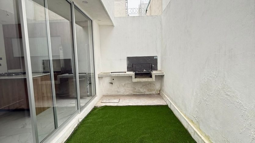 • Planta Baja: Cochera para dos autos, medio baño de visitas, sala con diseño en lambrín, cocina equipada con vista al jardín, comedor con ventilación natural y jardín con pasto sintético y área de asador.